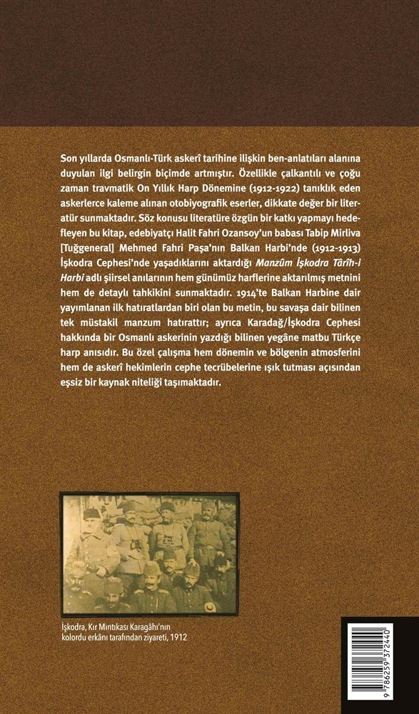 Son yıllarda Osmanlı-Türk askerî tarihine ilişkin ben-anlatıları alanına duyulan ilgi belirgin biçimde artmıştır. Özellikle çalkantılı ve çoğu zaman travmatik On Yıllık Harp Dönemine (1912-1922) tanıklık eden askerlerce kaleme alınan otobiyografik eserler, dikkate değer bir literatür sunmaktadır. Söz konusu literatüre özgün bir katkı yapmayı hedefleyen bu kitap, edebiyatçı Halit Fahri Ozansoy’un babası Tabip Mirliva [Tuğgeneral] Mehmed Fahri Paşa’nın Balkan Harbi’nde (1912-1913) İşkodra Cephesi’nde yaşadıklarını aktardığı Manzûm İşkodra Târîh-i Harbi adlı şiirsel anılarının hem günümüz harflerine aktarılmış metnini hem de detaylı tahkikini sunmaktadır. 1914’te Balkan Harbine dair yayımlanan ilk hatıratlardan biri olan bu metin, bu savaşa dair bilinen tek müstakil manzum hatırattır; ayrıca Karadağ/İşkodra Cephesi hakkında bir Osmanlı askerinin yazdığı bilinen yegâne matbu Türkçe harp anısıdır. Bu özel çalışma hem dönemin ve bölgenin atmosferini hem de askerî hekimlerin cephe tecrübelerine ışık tutması açısından eşsiz bir kaynak niteliği taşımaktadır.